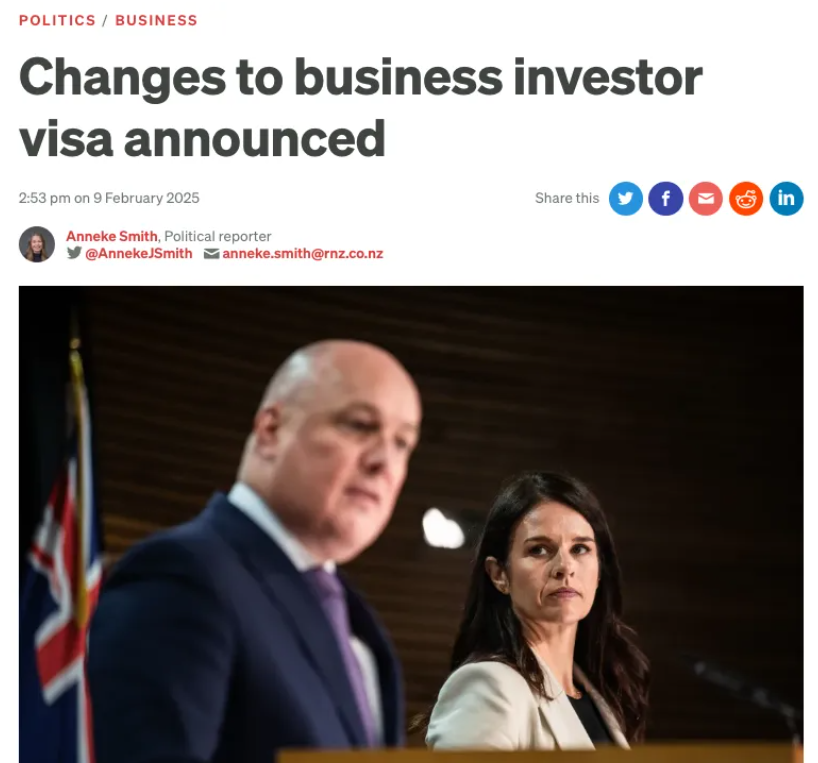 2025年2月9日,新西兰移民局宣布对积极投资者签证(Active Investor Visa)政策进行重大调整,新规将于2025年4月1日正式生效。
